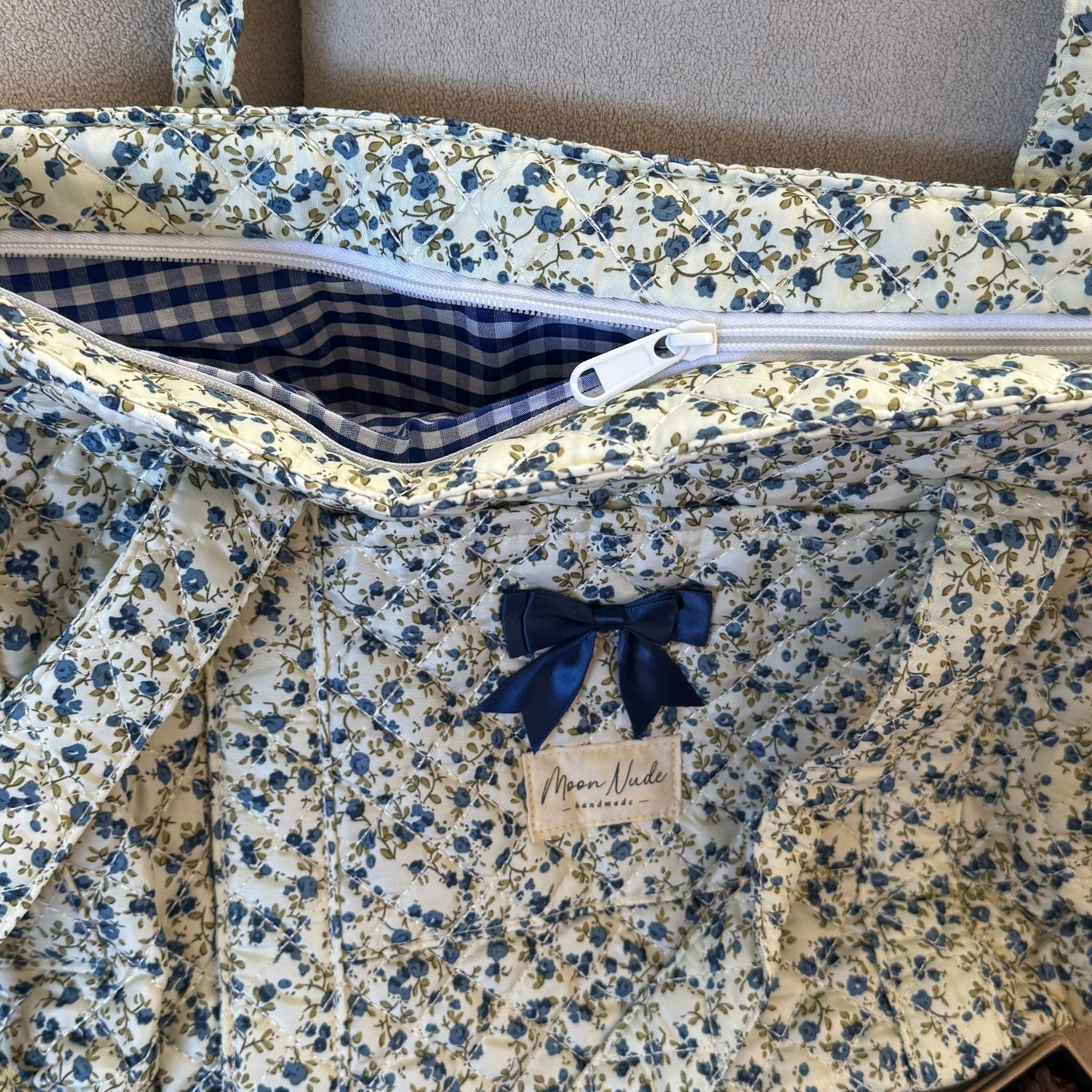 The quilted exterior boasts a beautiful floral pattern, complemented by the classy blue gingham interior.
