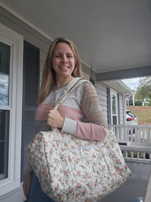 The quilted exterior features a beautiful strawberry-themed pattern, complemented by a classy pink gingham interior.